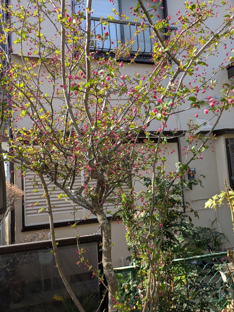 毎年、年間先に植えた、花海棠は桜より早く咲き始めます。桜の花を予言する花のようです。